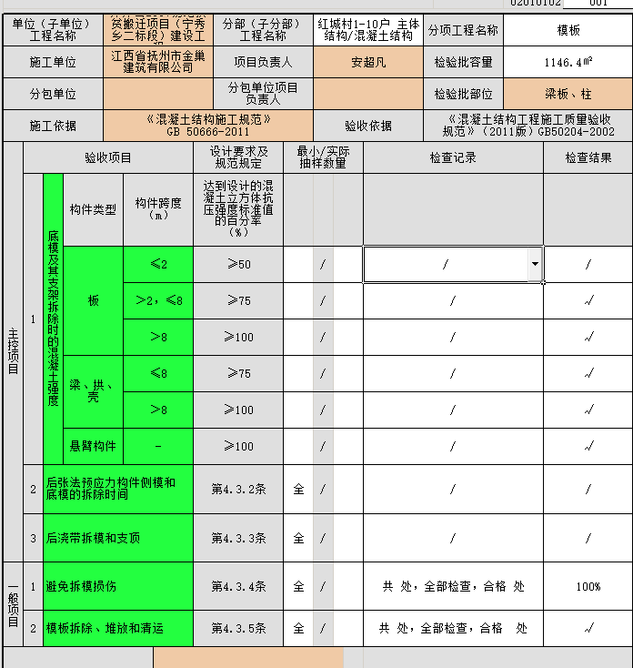 一般項目1項填寫“表面及棱角無損傷”,2項填寫“現(xiàn)場清理整潔,無堆載現(xiàn)象”
