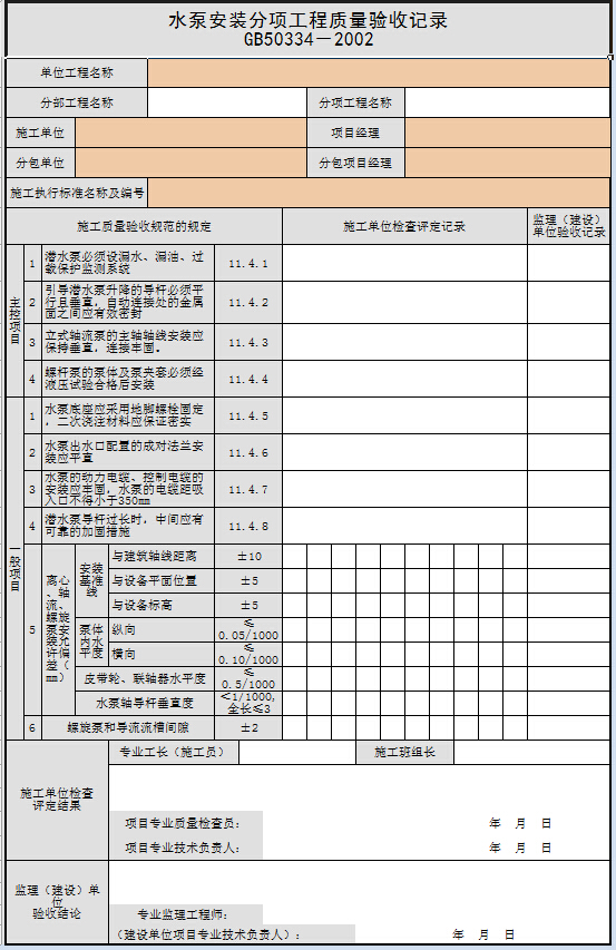 水泵安裝分項工程質(zhì)量驗收記錄
