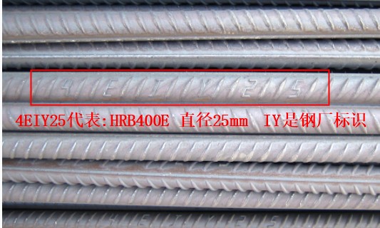 b) 鋼筋牌號(hào)以阿拉伯?dāng)?shù)字或阿拉伯?dāng)?shù)字加英文字母表示,HRB400、HRB500、HRB600分別以4、5、6表示,HRBF400、HRBF500分別以C4、C5表示,HRB400E、HRB500E分別以4E、5E表示,HRBF400E、HRBF500E分別以C4E、C5E表示。廠名以漢語(yǔ)拼音字頭表示。公稱直徑毫米數(shù)以阿拉伯?dāng)?shù)字表示。