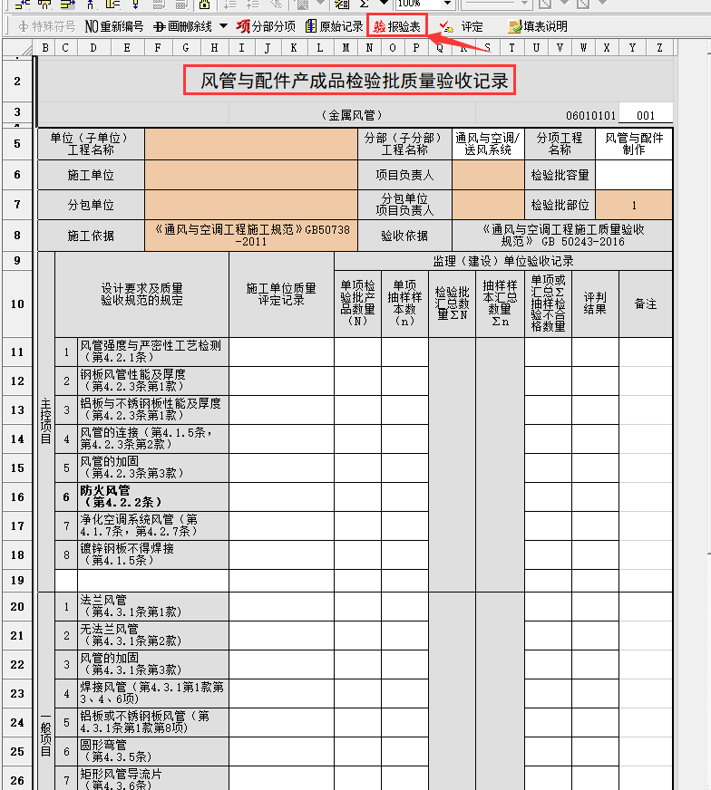 主管安裝選風(fēng)管檢驗(yàn)批,要注意不同材質(zhì)要選對(duì)應(yīng)的材質(zhì)的檢驗(yàn)批,報(bào)驗(yàn)表在檢驗(yàn)批表頭上方有個(gè)【報(bào)驗(yàn)表】的按鈕,填寫完檢驗(yàn)批以后直接單擊即可生成報(bào)驗(yàn)表