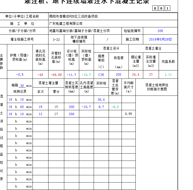 孔內(nèi)混凝土面高度:孔底標高減去每次觀測記錄時的孔內(nèi)混凝土面標高,它們的絕對值即為孔內(nèi)混凝土面高度。