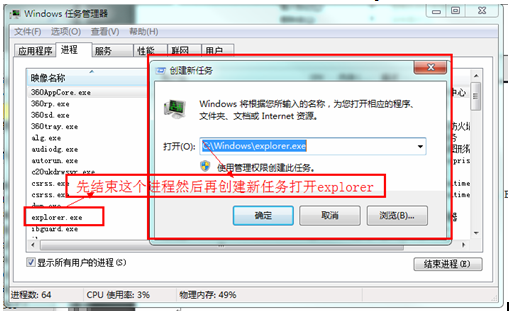 答:如下圖所示,打開電腦上的任務管理器(按住鍵盤上的ctrl+alt+delete鍵)在進程里面把explorer結束了,然后在文件—新建任務,到電腦C盤windows文件夾下面找到explorer.exe,點擊確定就可以了