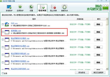 點擊“添加信任”按紐,然后選擇“暫不處理”按紐,再重新安裝軟件就可以了。程序模板安裝自動加到信任列表,如下圖: