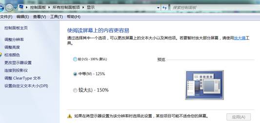 1)WIN7系統(tǒng)在控制面版里, 找到顯示, 把更改屏幕文本大小及其他的選項(xiàng),改成較小默認(rèn)顯示。