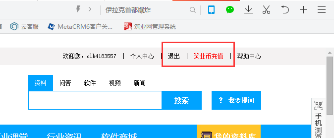 在整個(gè)網(wǎng)站的右上角,有筑業(yè)幣充值,