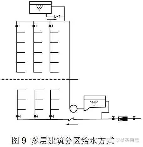 城市供水壓力不足,多層建筑只能滿足下部幾層的用水而不能供到上部樓層時(shí),為了能充分利用室外管網(wǎng)的壓力,常將室內(nèi)給水系統(tǒng)分為上下兩個(gè)供水區(qū)。