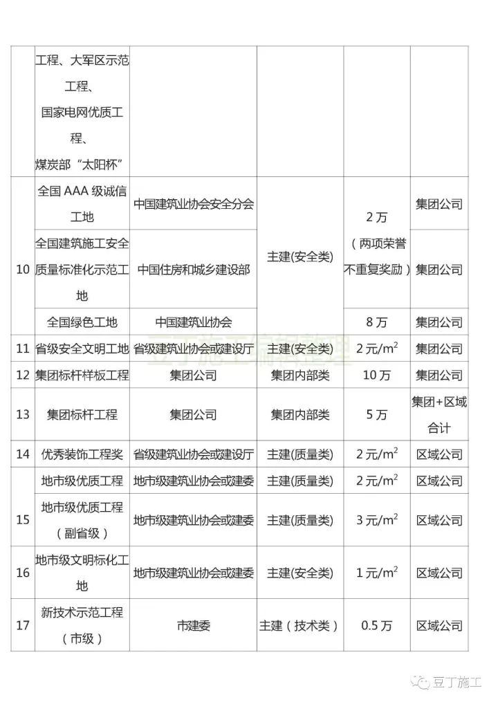 一、凡在建工程項(xiàng)目全部按2元/m2提取。其中集團(tuán)公司提取1.5元/m2 用于省級及以上榮譽(yù)、集團(tuán)內(nèi)部榮譽(yù)的獎勵,區(qū)域公司收取0.5元/m2用于市級及以下榮譽(yù)的獎勵。