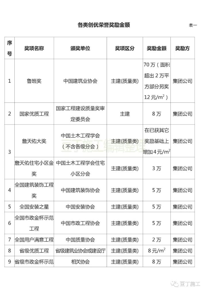 一、創(chuàng)優(yōu)榮譽(yù)分為質(zhì)量類、安全類、技術(shù)類及集團(tuán)內(nèi)部類。按項(xiàng)目所獲同類別最高榮譽(yù)獎勵,不重復(fù)計(jì)獎。各類創(chuàng)優(yōu)榮譽(yù)的獎勵辦法按“表一”執(zhí)行。