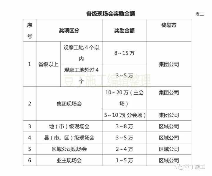 由當(dāng)?shù)刂鞴懿块T組織,在項(xiàng)目部召開省級、地(市)級、縣(市、區(qū))級表揚(yáng)現(xiàn)場會的,實(shí)行提前書面申報(bào)制度,及時(shí)報(bào)集團(tuán)工程管理部,并根據(jù)當(dāng)?shù)噩F(xiàn)場會的主題、影響力等情況,按“表二”對項(xiàng)目部給予不同的獎勵。