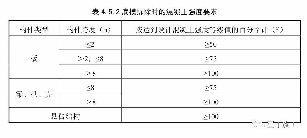 2)承重模板,包括梁、板等水平結(jié)構(gòu)構(gòu)件的底模,應(yīng)根據(jù)與結(jié)構(gòu)同條件養(yǎng)護(hù)的試塊強(qiáng)度達(dá)到下表的規(guī)定,方可拆除。