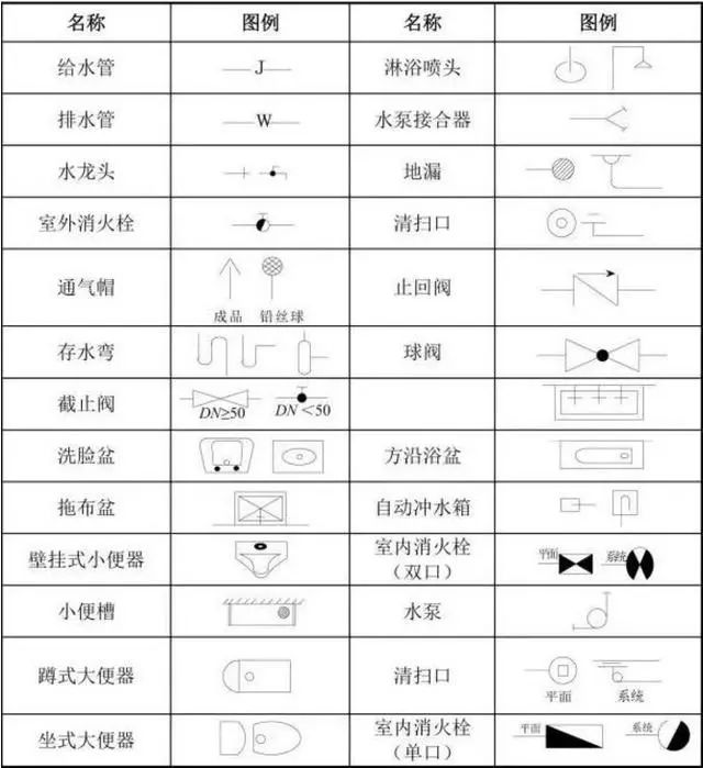 Q-流量或風(fēng)量 H-揚(yáng)程 N-功率 P-壓力 QW-潛污泵 其他閥門、器具類的都用圖形來區(qū)分。