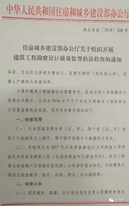 近日,住建部辦公廳發(fā)布通知,決定于2018年7月下旬起開(kāi)展建筑工程勘察設(shè)計(jì)質(zhì)量監(jiān)督執(zhí)法檢查,主要落實(shí)建設(shè)、勘察、設(shè)計(jì)單位項(xiàng)目負(fù)責(zé)人質(zhì)量終身責(zé)任制情況等內(nèi)容。