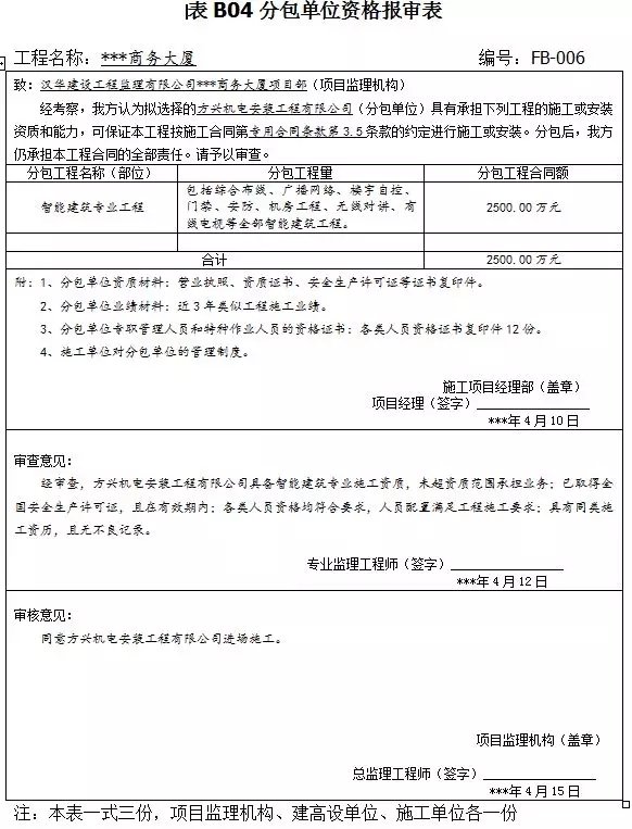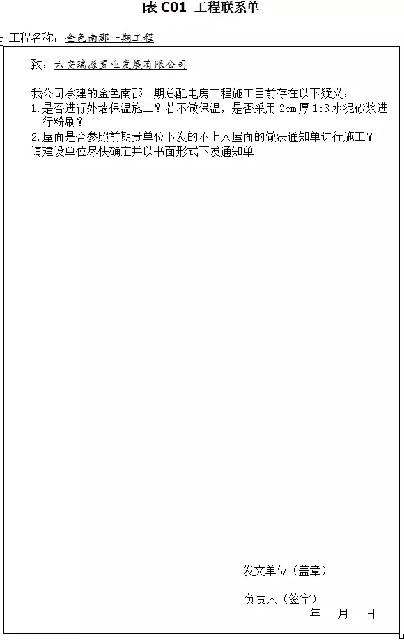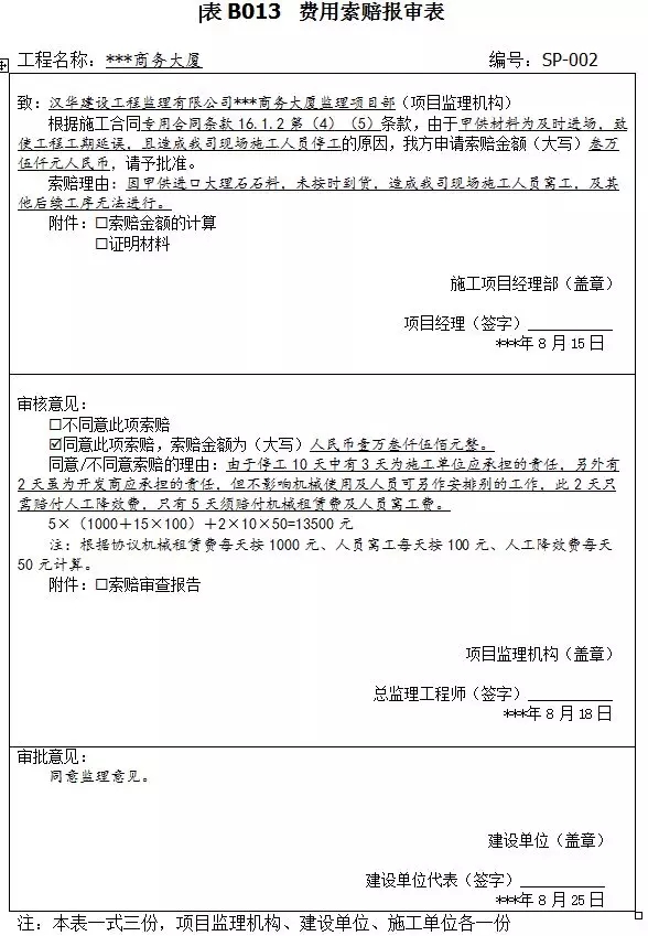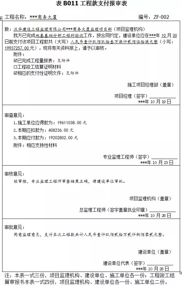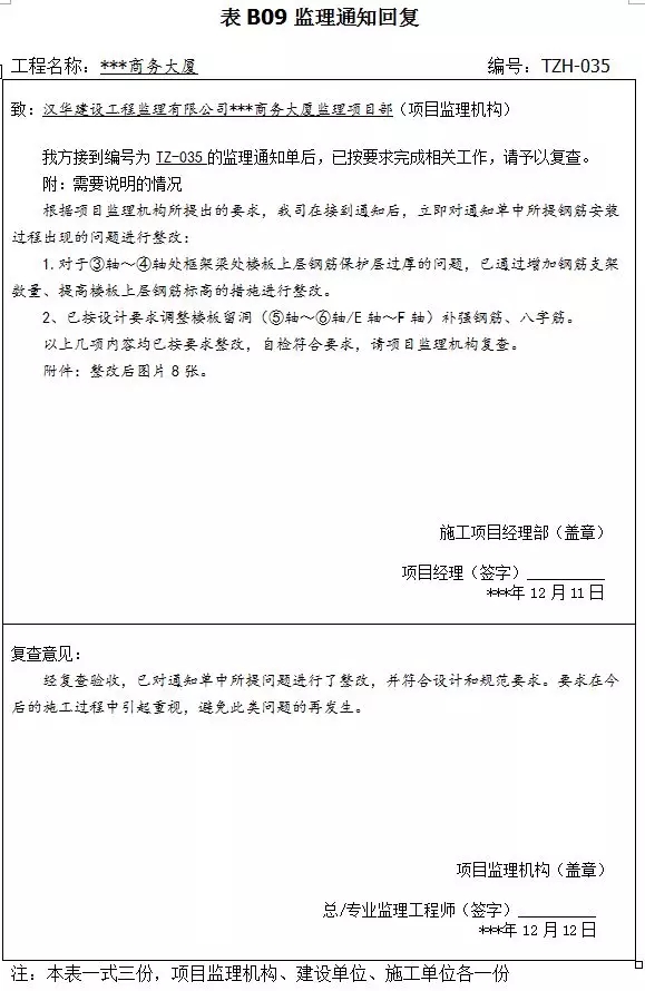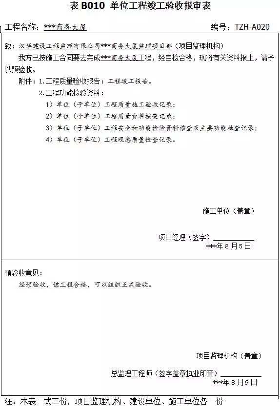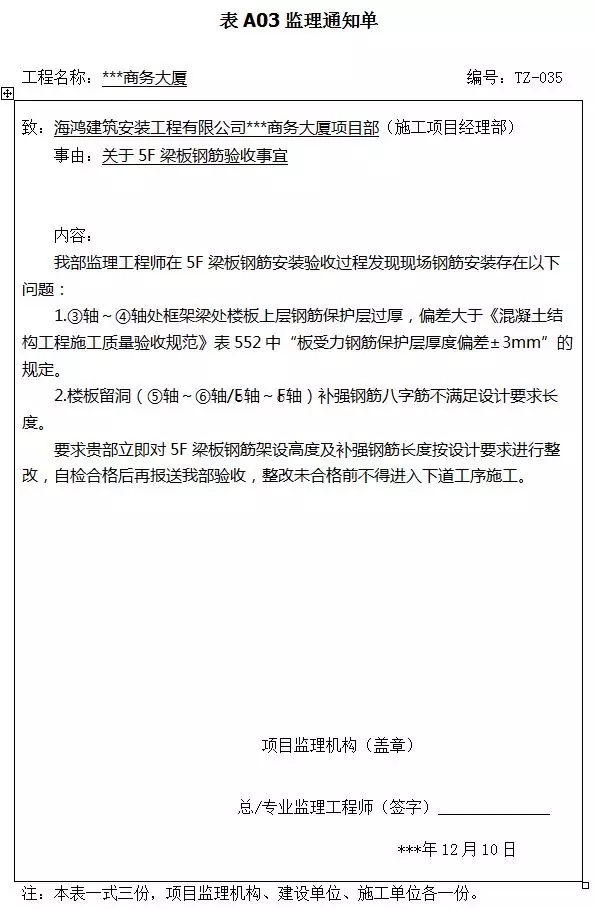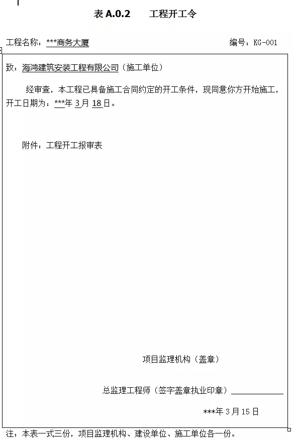 建設(shè)工程監(jiān)理規(guī)范(GB/T50319-2013) 表格填寫范例 建設(shè)工程監(jiān)理規(guī)范(GB/T50319-2013)自2014年3月1日起實(shí)施,原建設(shè)工程監(jiān)理規(guī)范(GB50319-2000)同時(shí)廢止。 新規(guī)范與原規(guī)范在表格上作了較大調(diào)整: 1、基本表式分A、B、C三類。原規(guī)范A類表為施工單位用表,B樓表為監(jiān)理單位用表,C類表為通用表;新規(guī)范A類表為監(jiān)理單位用表,B類表為施工單位用表,C類表為通用表。 2、原規(guī)范監(jiān)理單位用表6個(gè),施工單位用表10個(gè),通用表2個(gè);新規(guī)范監(jiān)理單位用表8個(gè),施工單位用表14個(gè),通用表3個(gè)。 3、新規(guī)范表格在制作內(nèi)容上比原規(guī)范表格更加嚴(yán)謹(jǐn),更加規(guī)范。 (1)部分表格增加了建設(shè)單位簽字欄; (2)不同內(nèi)容的表格對不同的簽字人、蓋不同的章均作了明確規(guī)定; (3)每種表格規(guī)定了制作的份數(shù)和存放單位。 4、新規(guī)范對按規(guī)定的表格填寫以單列條文的形式進(jìn)行規(guī)定,體現(xiàn)了使用規(guī)范附錄規(guī)定的表式的效力性。