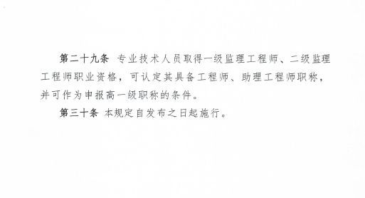 專業(yè)技術(shù)人員取得一級監(jiān)理工程師、二級監(jiān)理工程師職業(yè)資格,可認定其具備工程師、助理工程師職稱,并可作為申報高一級職稱的條件。