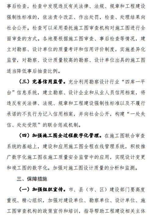 4、強(qiáng)化事后監(jiān)督檢查。對實行自審備案制的建設(shè)工程,市、縣(市、區(qū))建設(shè)部門要在基坑開挖前對施工圖進(jìn)行全面事后檢查。