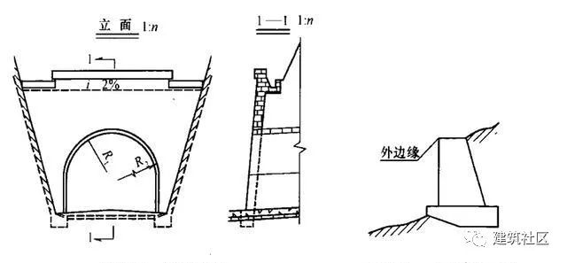 彎擋土墻在立面圖中的長(zhǎng)度,應(yīng)按擋土墻頂面外邊緣線的展開(kāi)長(zhǎng)度標(biāo)注(圖2-67)。