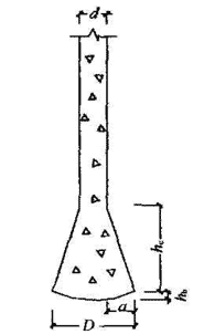 3)擴底端直徑與樁身直徑之比D/d,應(yīng)根據(jù)承載力要求及擴底端側(cè)面和樁端持力層土性特征以及擴底施工方法確定,挖孔樁的D/d不應(yīng)大于3,鉆孔樁的D/d不應(yīng)大于2.5,擴底端側(cè)面的斜率應(yīng)根據(jù)實際成孔及土體自立條件確定,a/hc可取1/4~1/2,砂土可取1/4,粉土、黏性土可取1/3~1/2,抗壓樁擴底端底面宜呈鍋底形,矢高h(yuǎn)b可取(0.15~0.20)D(見下圖1);