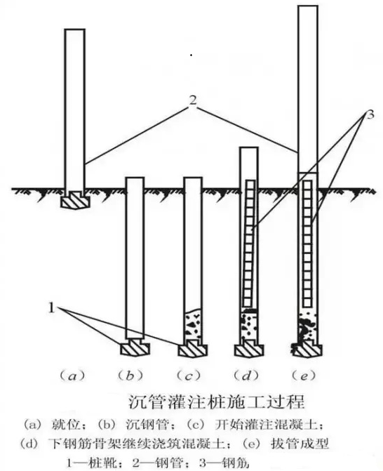 場地平整→樁位放線→樁機就位→錘擊(振動)沉管→驗孔→澆筑混凝土→邊錘擊(振動)邊拔管→澆筑混凝土→下鋼筋籠→澆筑混凝土及拔管→成樁。