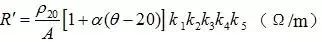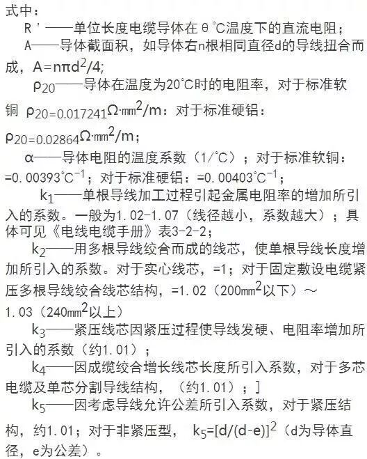 2. 導體電阻 單位長度電纜的導直流電阻用下式計算: 20℃導體直流電阻詳見下表(點擊放大): 以上摘錄于《10(6)kV~500kV電纜技術標準》(Q∕GDW 371-2009 )。 在交流電壓下,線芯電阻將由于集膚效應、鄰近效應而增大,這種情況下的電阻稱為有效電阻或交流電阻。 電纜線芯的有效電阻,國內一般均采用IEC-287推薦的公式 : R=R′(1+YS+YP) 式中: R——最高工作溫度下交流有效電阻,Ω/m; R′——最高工作溫度下直流電阻,Ω/m; YS——集膚效應系數(shù),YS=XS4/(192+0.8XS4), XS4=(8πf/R′×10-7kS)2; YP——鄰近效應系數(shù), XS4——集膚效應中頻率與導體結構影響作用; XP4——鄰近效應中導體相互間產生的交變磁場影響作用; f——頻率; Dc——線芯直徑,m; S——線芯中心軸間距離,m; ks——線芯結構常數(shù),分割導體ks=0.435,其他導體ks=1.0; kp——線芯結構系數(shù),分割導體kp=0.37,其他導體kp= 0.8~1.0; 對于使用磁性材料制做的鎧裝或護套電纜,Yp和Ys應比計算值大70%,即: R=R′[1+1.17(YS+YP)]2.1導體直流電阻