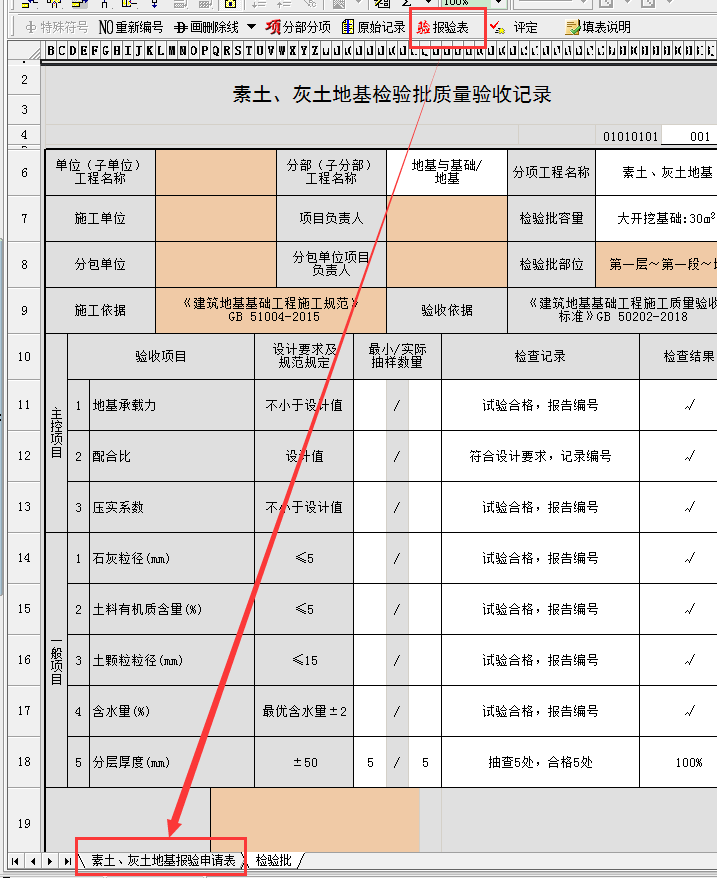 點(diǎn)擊檢驗(yàn)批表頭上方的報(bào)驗(yàn)表按鈕,下方會(huì)生成一個(gè)報(bào)驗(yàn)申請(qǐng)表的表頁(yè),如下圖:
