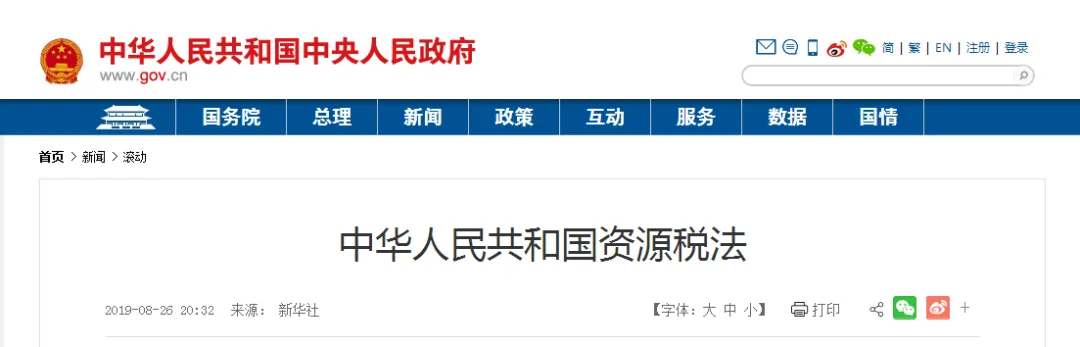 (2019年8月26日第十三屆全國(guó)人民代表大會(huì)常務(wù)委員會(huì)第十二次會(huì)議通過(guò))第一條 在中華人民共和國(guó)領(lǐng)域和中華人民共和國(guó)管轄的其他海域開(kāi)發(fā)應(yīng)稅資源的單位和個(gè)人,為資源稅的納稅人,應(yīng)當(dāng)依照本法規(guī)定繳納資源稅。應(yīng)稅資源的具體范圍,由本法所附《資源稅稅目稅率表》(以下稱《稅目稅率表》)確定。第二條 資源稅的稅目、稅率,依照《稅目稅率表》執(zhí)行。《稅目稅率表》中規(guī)定實(shí)行幅度稅率的,其具體適用稅率由省、自治區(qū)、直轄市人民政府統(tǒng)籌考慮該應(yīng)稅資源的品位、開(kāi)采條件以及對(duì)生態(tài)環(huán)境的影響等情況,在《稅目稅率表》規(guī)定的稅率幅度內(nèi)提出,報(bào)同級(jí)人民代表大會(huì)常務(wù)委員會(huì)決定,并報(bào)全國(guó)人民代表大會(huì)常務(wù)委員會(huì)和國(guó)務(wù)院備案?!抖惸慷惵时怼分幸?guī)定征稅對(duì)象為原礦或者選礦的,應(yīng)當(dāng)分別確定具體適用稅率。第三條 資源稅按照《稅目稅率表》實(shí)行從價(jià)計(jì)征或者從量計(jì)征。《稅目稅率表》中規(guī)定可以選擇實(shí)行從價(jià)計(jì)征或者從量計(jì)征的,具體計(jì)征方式由省、自治區(qū)、直轄市人民政府提出,報(bào)同級(jí)人民代表大會(huì)常務(wù)委員會(huì)決定,并報(bào)全國(guó)人民代表大會(huì)常務(wù)委員會(huì)和國(guó)務(wù)院備案。實(shí)行從價(jià)計(jì)征的,應(yīng)納稅額按照應(yīng)稅資源產(chǎn)品(以下稱應(yīng)稅產(chǎn)品)的銷售額乘以具體適用稅率計(jì)算。實(shí)行從量計(jì)征的,應(yīng)納稅額按照應(yīng)稅產(chǎn)品的銷售數(shù)量乘以具體適用稅率計(jì)算。應(yīng)稅產(chǎn)品為礦產(chǎn)品的,包括原礦和選礦產(chǎn)品。第四條 納稅人開(kāi)采或者生產(chǎn)不同稅目應(yīng)稅產(chǎn)品的,應(yīng)當(dāng)分別核算不同稅目應(yīng)稅產(chǎn)品的銷售額或者銷售數(shù)量;未分別核算或者不能準(zhǔn)確提供不同稅目應(yīng)稅產(chǎn)品的銷售額或者銷售數(shù)量的,從高適用稅率。第五條 納稅人開(kāi)采或者生產(chǎn)應(yīng)稅產(chǎn)品自用的,應(yīng)當(dāng)依照本法規(guī)定繳納資源稅;但是,自用于連續(xù)生產(chǎn)應(yīng)稅產(chǎn)品的,不繳納資源稅。(一)開(kāi)采原油以及在油田范圍內(nèi)運(yùn)輸原油過(guò)程中用于加熱的原油、天然氣;(二)煤炭開(kāi)采企業(yè)因安全生產(chǎn)需要抽采的煤成(層)氣。(一)從低豐度油氣田開(kāi)采的原油、天然氣,減征百分之二十資源稅;(二)高含硫天然氣、三次采油和從深水油氣田開(kāi)采的原油、天然氣,減征百分之三十資源稅;(四)從衰竭期礦山開(kāi)采的礦產(chǎn)品,減征百分之三十資源稅。根據(jù)國(guó)民經(jīng)濟(jì)和社會(huì)發(fā)展需要,國(guó)務(wù)院對(duì)有利于促進(jìn)資源節(jié)約集約利用、保護(hù)環(huán)境等情形可以規(guī)定免征或者減征資源稅,報(bào)全國(guó)人民代表大會(huì)常務(wù)委員會(huì)備案。第七條 有下列情形之一的,省、自治區(qū)、直轄市可以決定免征或者減征資源稅:(一)納稅人開(kāi)采或者生產(chǎn)應(yīng)稅產(chǎn)品過(guò)程中,因意外事故或者自然災(zāi)害等原因遭受重大損失;(二)納稅人開(kāi)采共伴生礦、低品位礦、尾礦。前款規(guī)定的免征或者減征資源稅的具體辦法,由省、自治區(qū)、直轄市人民政府提出,報(bào)同級(jí)人民代表大會(huì)常務(wù)委員會(huì)決定,并報(bào)全國(guó)人民代表大會(huì)常務(wù)委員會(huì)和國(guó)務(wù)院備案。第八條 納稅人的免稅、減稅項(xiàng)目,應(yīng)當(dāng)單獨(dú)核算銷售額或者銷售數(shù)量;未單獨(dú)核算或者不能準(zhǔn)確提供銷售額或者銷售數(shù)量的,不予免稅或者減稅。第九條 資源稅由稅務(wù)機(jī)關(guān)依照本法和《中華人民共和國(guó)稅收征收管理法》的規(guī)定征收管理。稅務(wù)機(jī)關(guān)與自然資源等相關(guān)部門應(yīng)當(dāng)建立工作配合機(jī)制,加強(qiáng)資源稅征收管理。第十條 納稅人銷售應(yīng)稅產(chǎn)品,納稅義務(wù)發(fā)生時(shí)間為收訖銷售款或者取得索取銷售款憑據(jù)的當(dāng)日;自用應(yīng)稅產(chǎn)品的,納稅義務(wù)發(fā)生時(shí)間為移送應(yīng)稅產(chǎn)品的當(dāng)日。第十一條 納稅人應(yīng)當(dāng)向應(yīng)稅產(chǎn)品開(kāi)采地或者生產(chǎn)地的稅務(wù)機(jī)關(guān)申報(bào)繳納資源稅。第十二條 資源稅按月或者按季申報(bào)繳納;不能按固定期限計(jì)算繳納的,可以按次申報(bào)繳納。納稅人按月或者按季申報(bào)繳納的,應(yīng)當(dāng)自月度或者季度終了之日起十五日內(nèi),向稅務(wù)機(jī)關(guān)辦理納稅申報(bào)并繳納稅款;按次申報(bào)繳納的,應(yīng)當(dāng)自納稅義務(wù)發(fā)生之日起十五日內(nèi),向稅務(wù)機(jī)關(guān)辦理納稅申報(bào)并繳納稅款。第十三條 納稅人、稅務(wù)機(jī)關(guān)及其工作人員違反本法規(guī)定的,依照《中華人民共和國(guó)稅收征收管理法》和有關(guān)法律法規(guī)的規(guī)定追究法律責(zé)任。第十四條 國(guó)務(wù)院根據(jù)國(guó)民經(jīng)濟(jì)和社會(huì)發(fā)展需