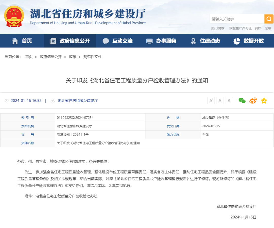 2024年1月15日,湖北省住房和城鄉(xiāng)建設(shè)廳發(fā)布《湖北省住宅工程質(zhì)量分戶驗收管理辦法》,根據(jù)《建設(shè)工程質(zhì)量管理條例》及有關(guān)文件,結(jié)合當(dāng)前實際最新修訂,進一步加強住宅工程質(zhì)量驗收管理,強化建設(shè)單位工程質(zhì)量首要責(zé)任,落實各方主體責(zé)任,推動住宅工程品質(zhì)全面提升。